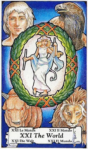 Świat (Wszechświat) oznaczony jest cyfrą dwadzieścia jeden. Reprezentuje początek. Przypomina nam, iż zasoby wszechświata są nieograniczone. Jest dużo tajemnic do odkrycia. Pokazuje to, iż pewien okres się skończył, jednakże podróż życia nie ma końca ani celu. Tak samo, jak koło. Nie można wskazać początku ani końca. Karta chce wyzwolić nas od czegoś, co nas powstrzymuje, uniemożliwia rozwój. Czasem możemy ziać niechęcią do tej karty, bo wymusza pożegnanie z czymś ważnym. Z pewnością byliśmy mocno przywiązani. Jako efekt bolesnej straty, pojawia się wrażenie niesprawiedliwości losu, smutek oraz pretensje. Jednakże po czasie zrozumiemy, że było to konieczne, żeby zyskać nowe możliwości i otworzyć się na nie.